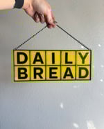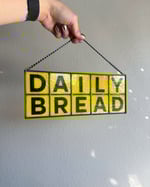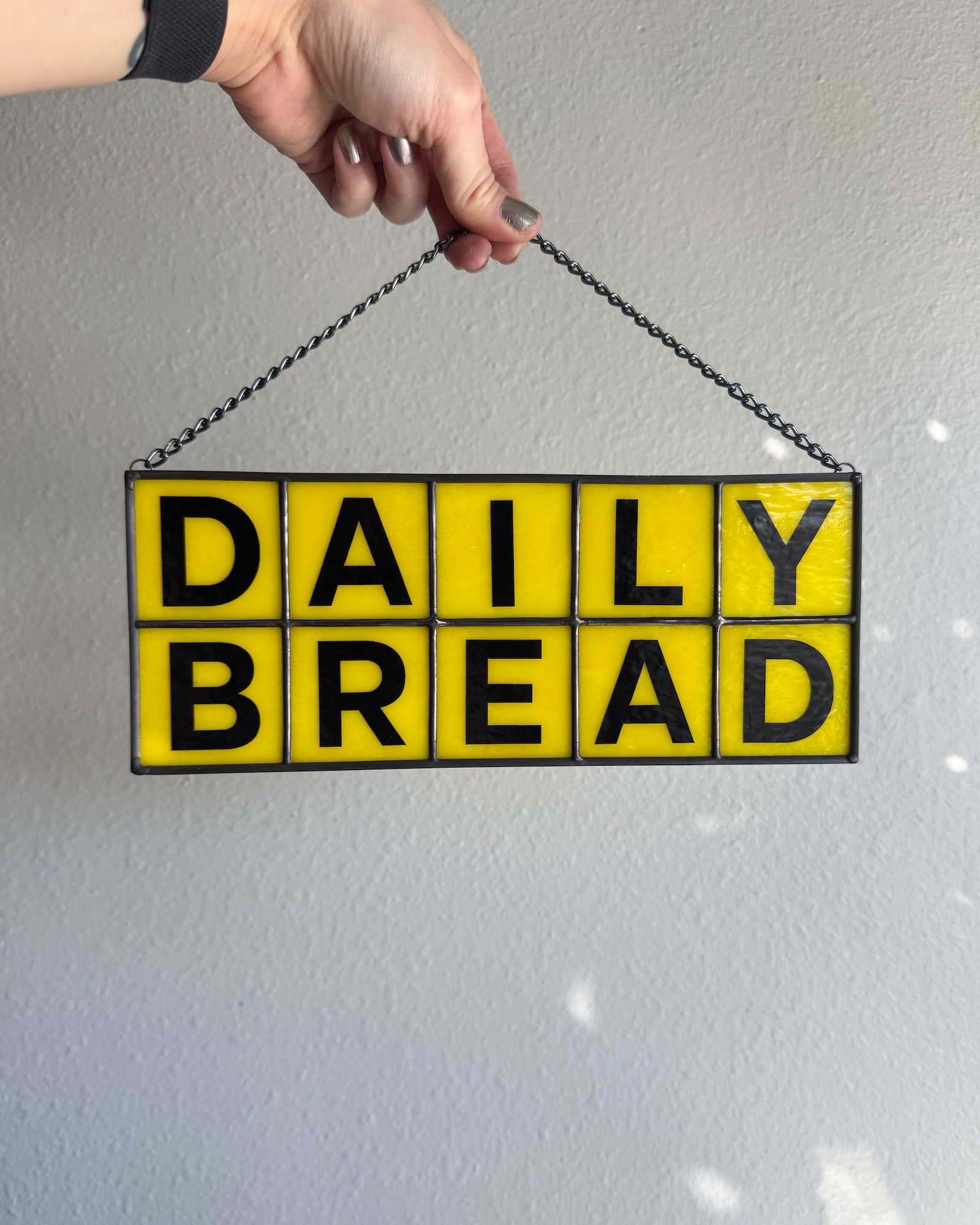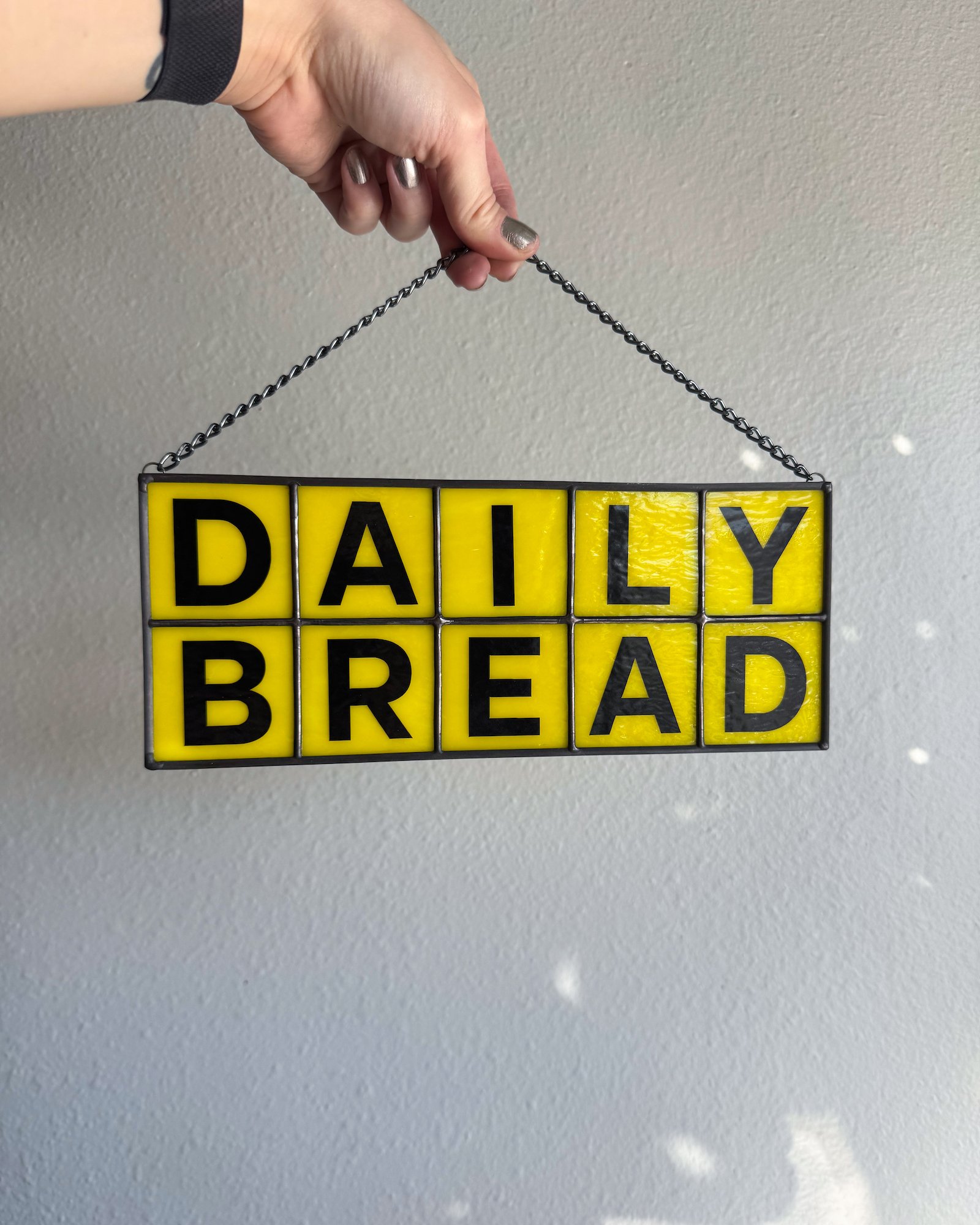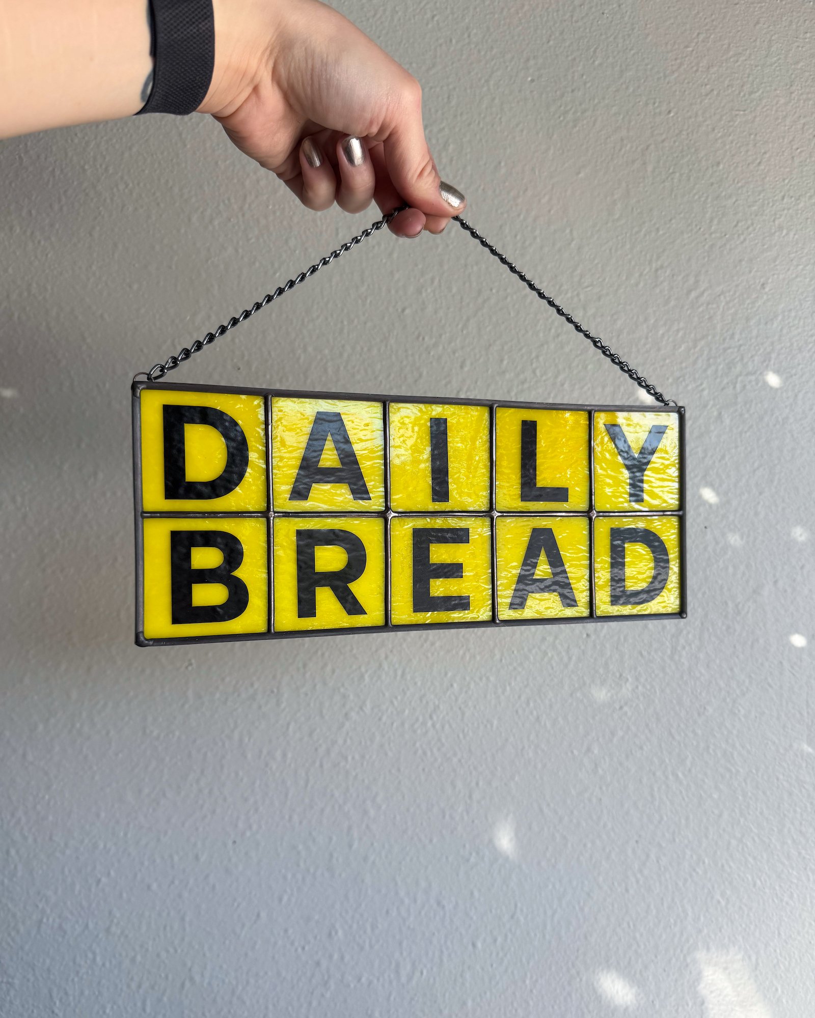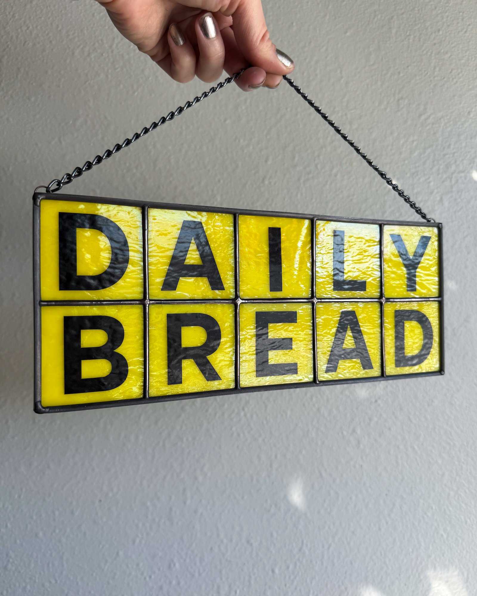 Yellow glass with black vinyl lettering, solder, framing + chain.