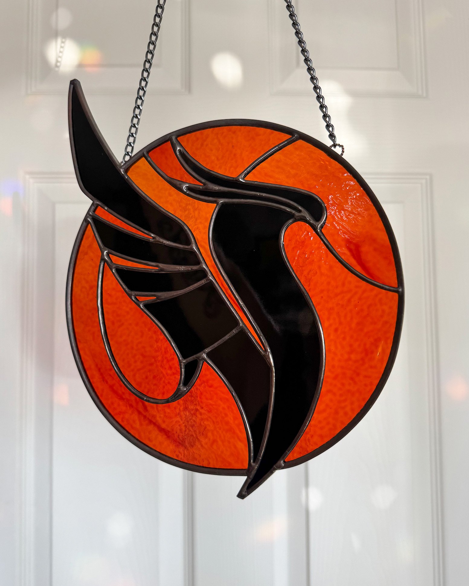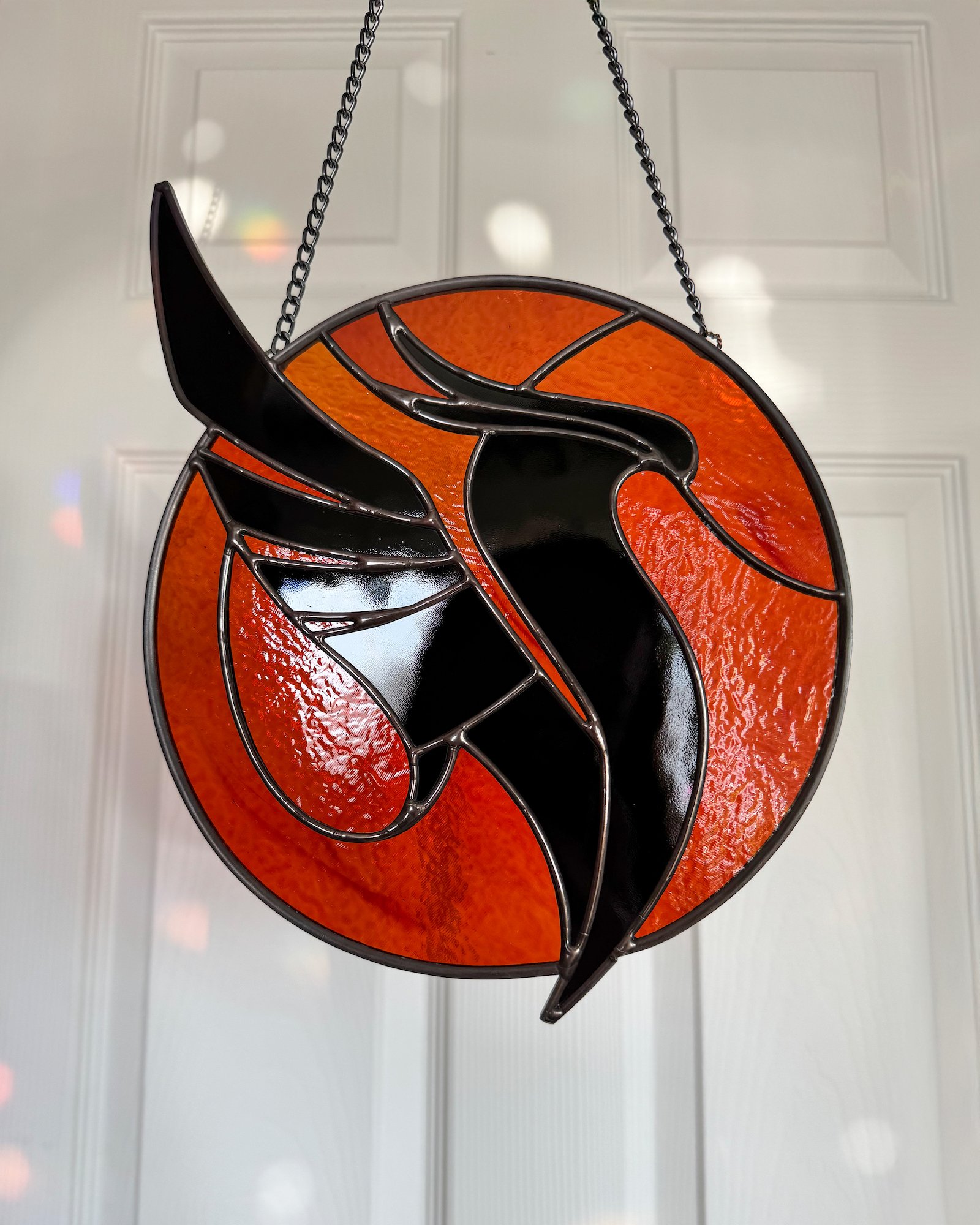 Orange + opaque black glass with black solder, framing and chain.